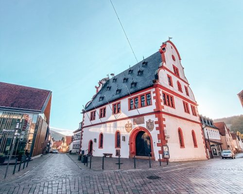 Das prächtige Alte Rathaus prägt den Altort von Bürgstadt und zeugt vom einstigen Wohlstand der Gemeinde – geprägt vom berühmten Bürgstadter Wein. Besonders sehenswert sind die leuchtenden Glasfenster im Rathaussaal und die kunstvolle Innenausmalung, die eine Verbindung zur Martinskapelle herstellt.